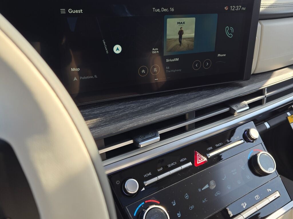 - Radio: AM/FM/HD Bose Premium Audio System -inc: 12 speakers including subwoofer, external amplifier, 12.3" wide touchscreen, Apple CarPlay and Android Auto, Bluetooth® hands-free w/wireless audio streaming, dynamic voice recognition, USB connectivity, SiriusXM, Blue Link+ connected car system, over-the-air updating capability, navigation system including traffic flow w/incident data via HD Radio (HERE) and rear seat quiet mode